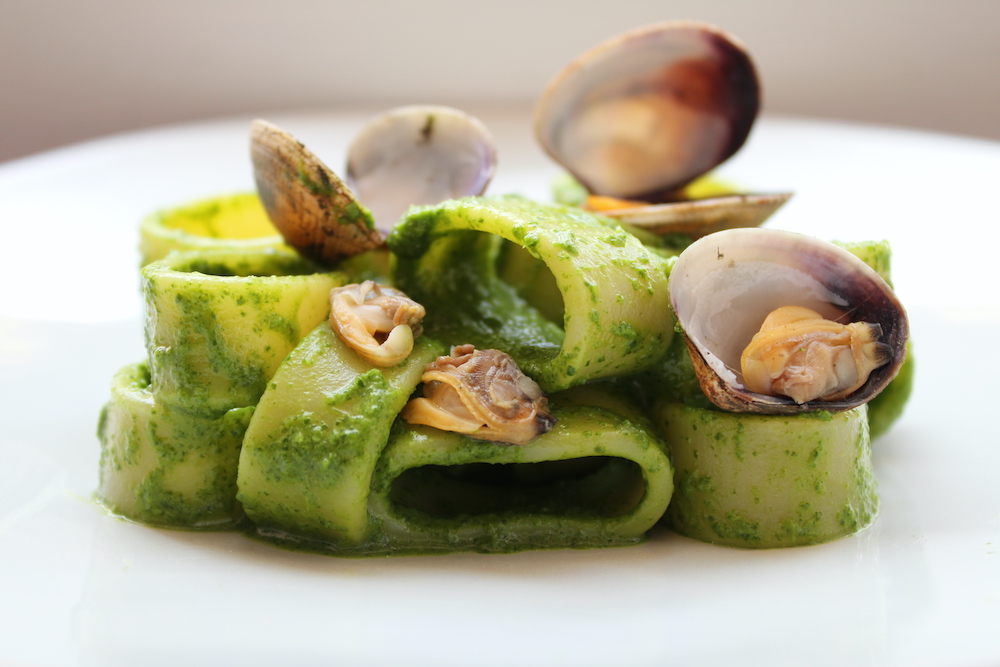 Calamarata, palourdes, pesto de fanes de radis, anchois