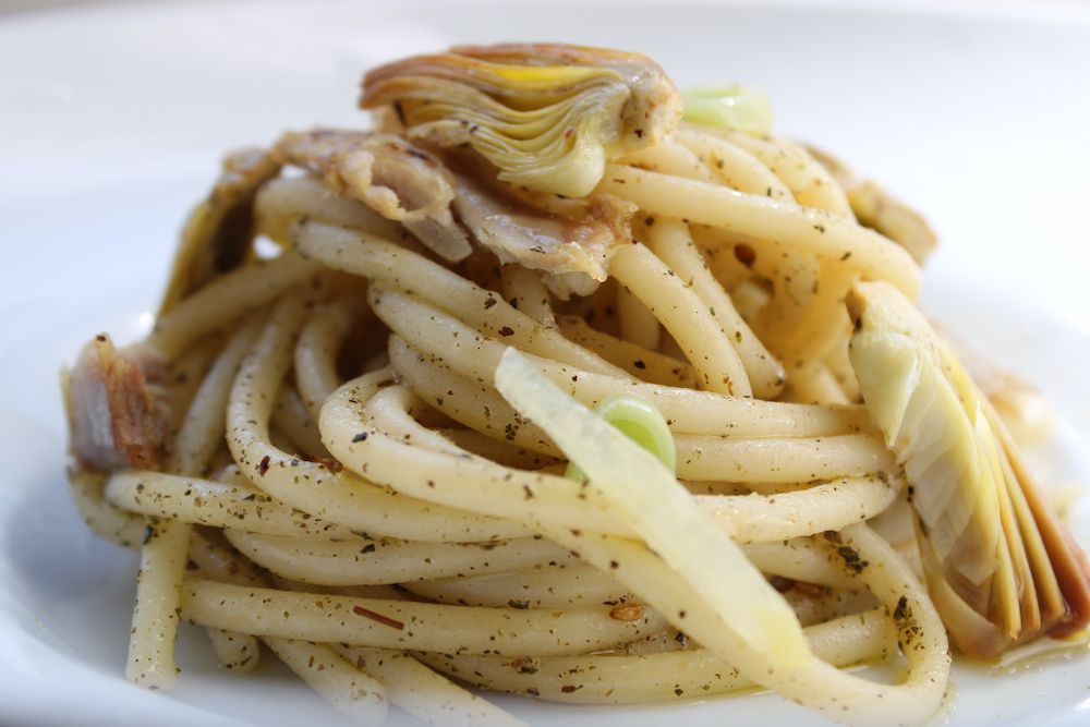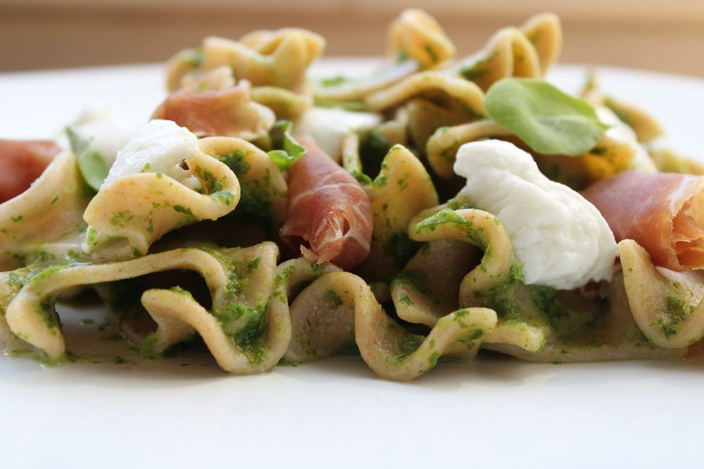 200 g de farine blanche 00 – 150 g de farine de blé dur – 3 oeufs – huile d’olive – sel