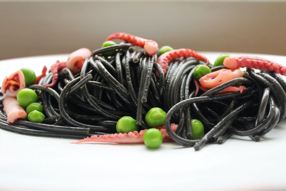 Tagliolini à l’encre de seiche, petits pois, calamars