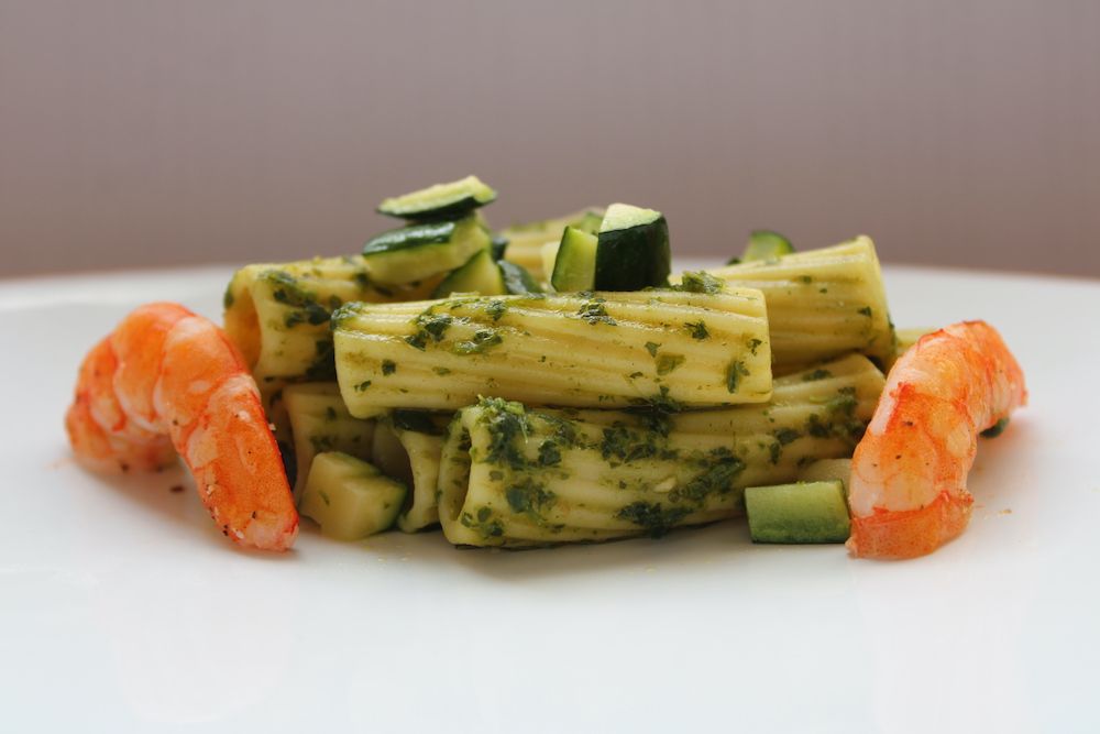 Tortiglioni, crevettes, courgettes, pesto basilic-sarriette