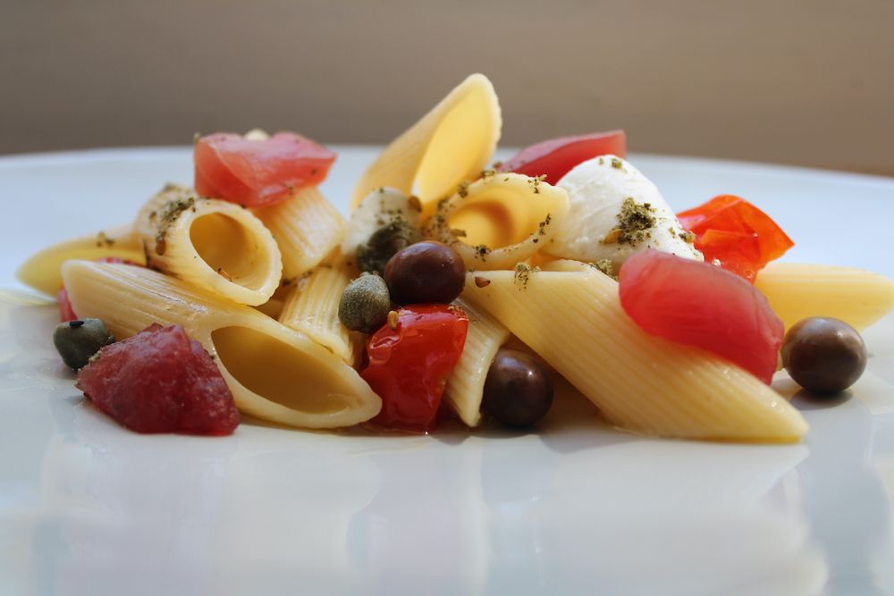 Pennoni, thon, tomates, olives, câpres & mozzarella