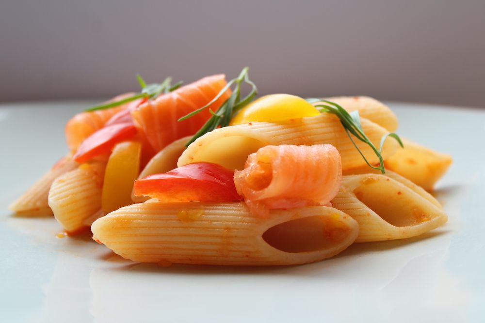 Pennoni, saumon, coulis de poivrons, compotée d’oignons, estragon