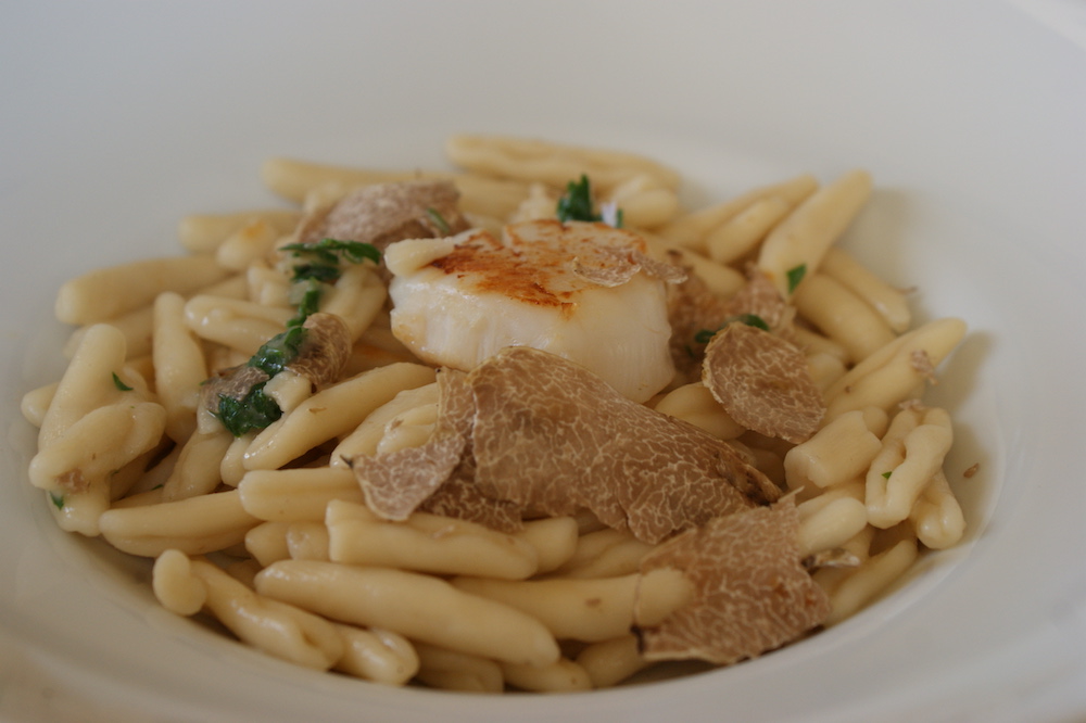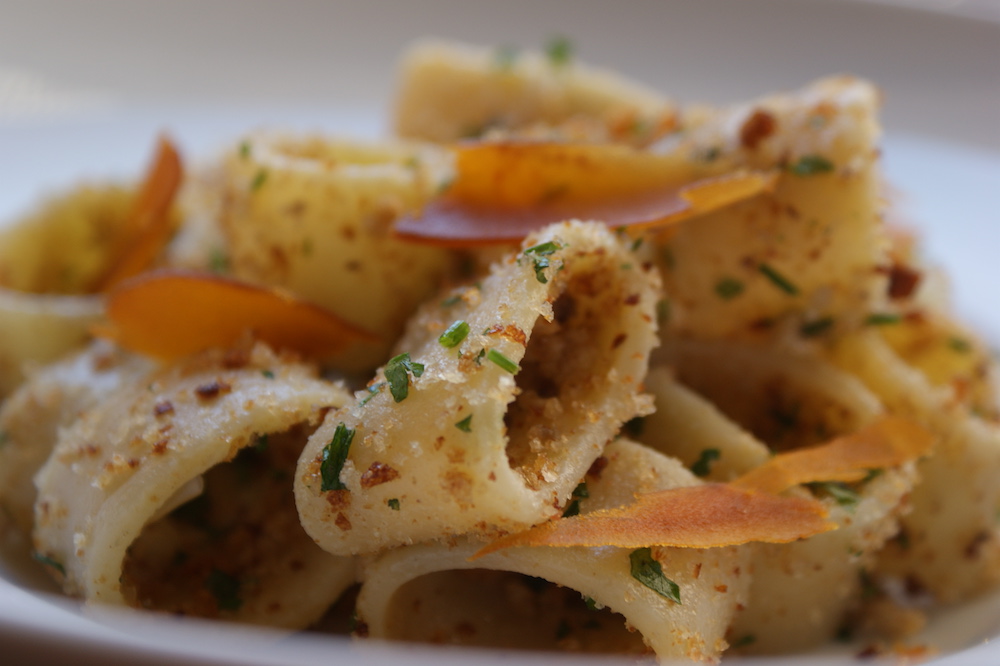 Saupoudrer chaque assiette du reste des tranches de poutargue.
