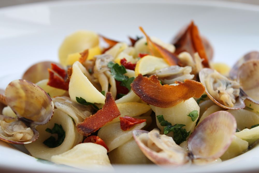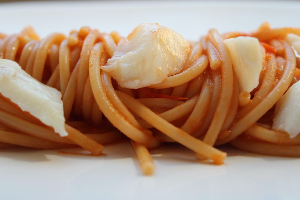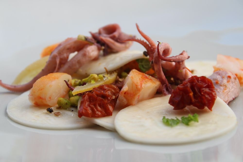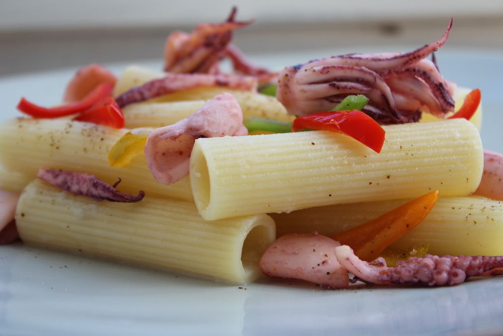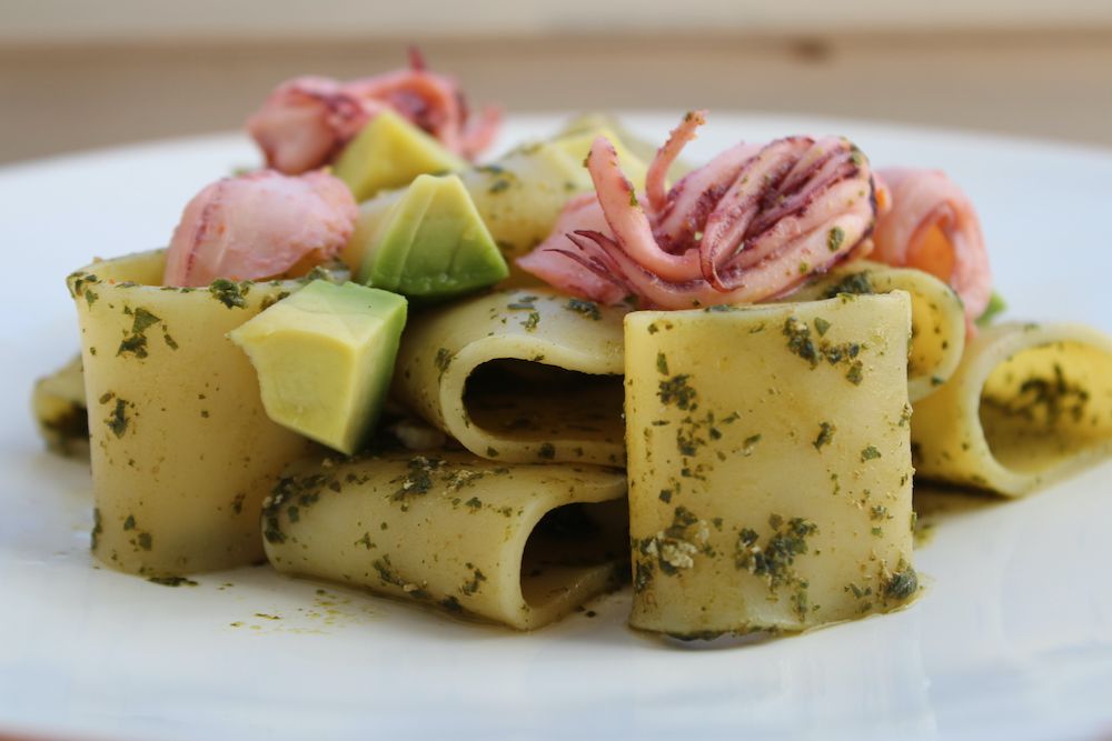 Nettoyer et couper en rondelles les calamars qui doivent être petits et tendres. Les saisir à feu vif avec un filet d’huile d’olive. Cuire 10 minutes à feu doux. Déglacer avec le jus d’un citron. Ajouter quelques filaments de piments. Récupérer le jus de cuisson.