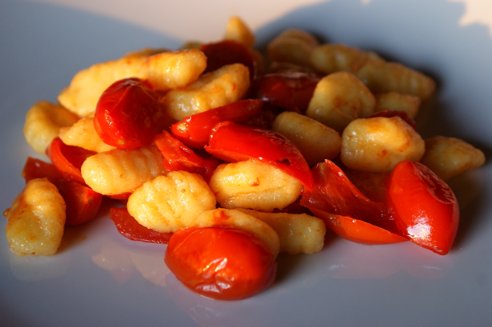 Faire revenir à feu doux dans une poêle avec quelques cuillères d’huile d’olive le piment coupé en morceaux, les deux gousses d’ail hachées et les filets d’anchois.
