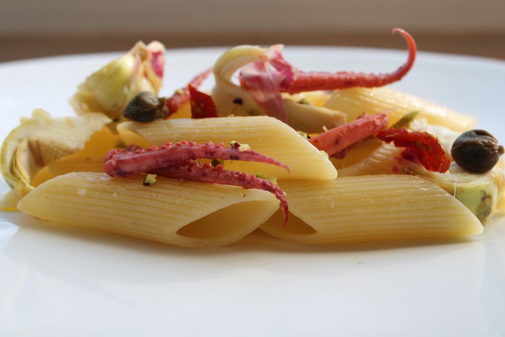Cuire les pennoni dans un grand volume d’eau salée et bouillante. Les égoutter al dente, les incorporer à l’ensemble encornets-artichauts. Ajouter les câpres.