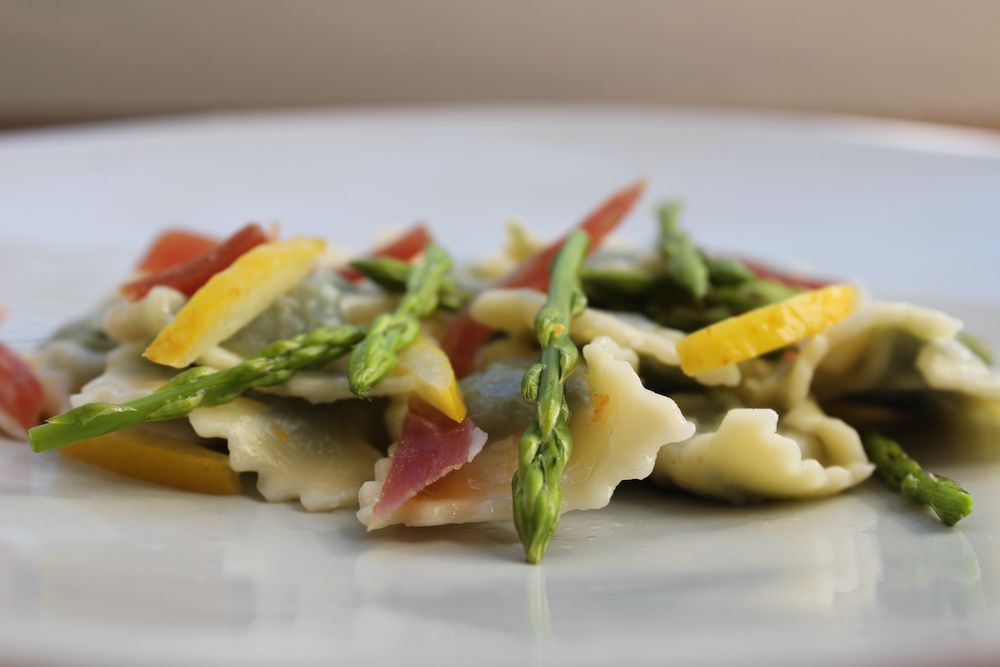 Mettre 6 ravioli par assiette. Les recouvrir de pointes d’asperges, de lanières de jambon et de citron confit. Arroser d’un filet d’huile d’olive. Poivrer.