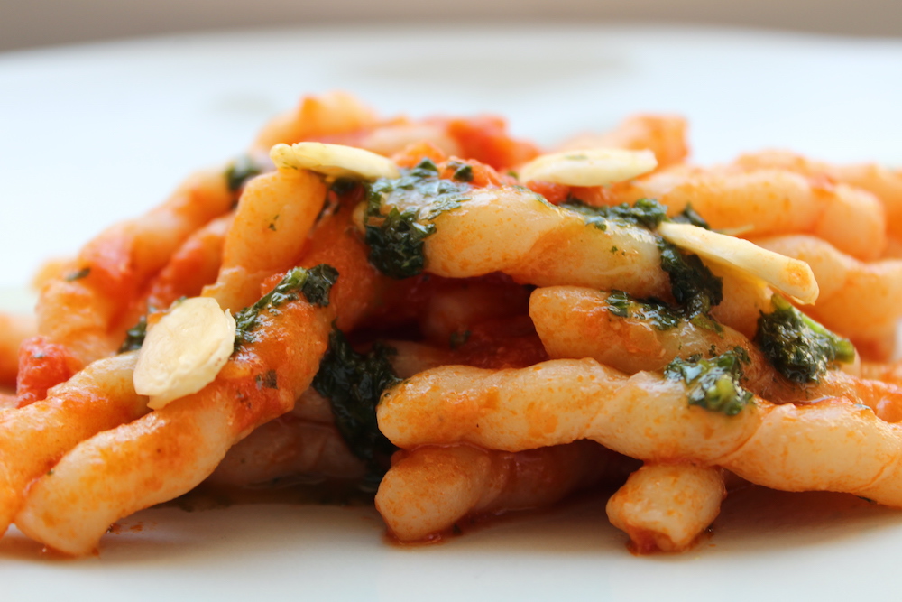 Pour une fois, le pesto est rouge. Nous sommes au cœur de la Sicile. A la fois par le choix des pâtes (les busiate), les tomates (de Pachino), l’ail (de Nubia), le pecorino et les amandes. Mais aussi – et surtout – par le concentré de tomates sicilien, appelé « u strattu ». Plus qu’une recette, le strattu a longtemps été un rite estival. Les familles siciliennes mettaient à sécher au soleil pendant au moins trois jours la sauce de tomates qu’elles avaient réalisée, jusqu’à l’obtention d’un concentré particulièrement goûteux qu’elles utilisaient durant l’hiver.