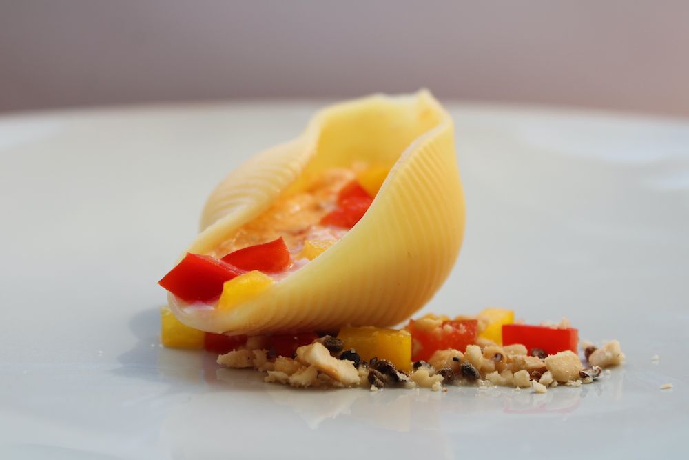 Le plaisir de manger du bout des doigts. Une conchiglie se déguste en deux bouchées. Dans cette recette, la crème à base de mozzarella est la gourmandise suprême avec le risque (espéré, attendu, souhaité) qu’elle se faufile et aboutisse entre le pouce et l’index. On joue ensuite sur trois notes : le gras sucré des noisettes, la vivacité végétale de la cardamome et l’amertume du poivron. Le crumble est ici l’épice qui englobe les autres saveurs, gratifie l’assiette d’une belle vivacité. Le plat terminé, on se dit que la conchiglie est un format de pâte ô combien gourmand.