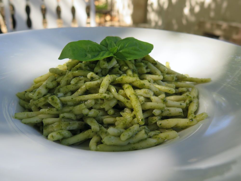 On est au cœur d’une région : la Ligurie. Pour le basilic, l’huile d’olive, les pignons et les trofie. Une cuisine paysanne des contreforts des Alpes, et non pas une cuisine du littoral même si, parfois, anchois et poulpe se glissent dans les assiettes. Il s’agit ici de la recette traditionnelle des trofie « al pesto di basilico », donc avec haricots verts et pommes de terre. On peut cuire les légumes séparément et utiliser l’eau de cuisson des haricots pour celle des trofie. Mais on peut aussi réaliser ce plat sans les pommes de terre, ni les haricots verts, uniquement avec le pesto de basilic.