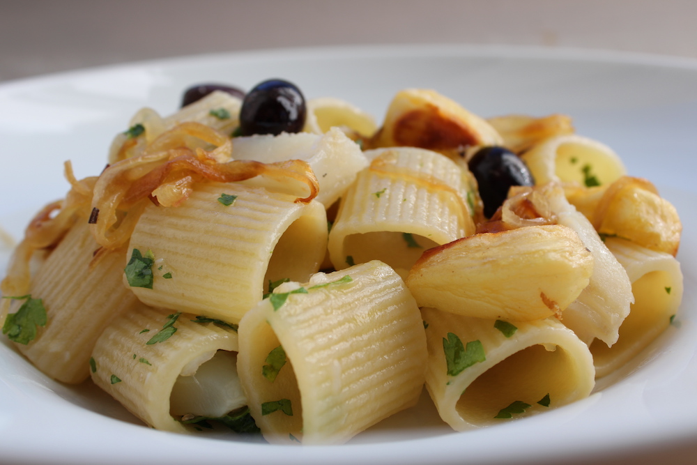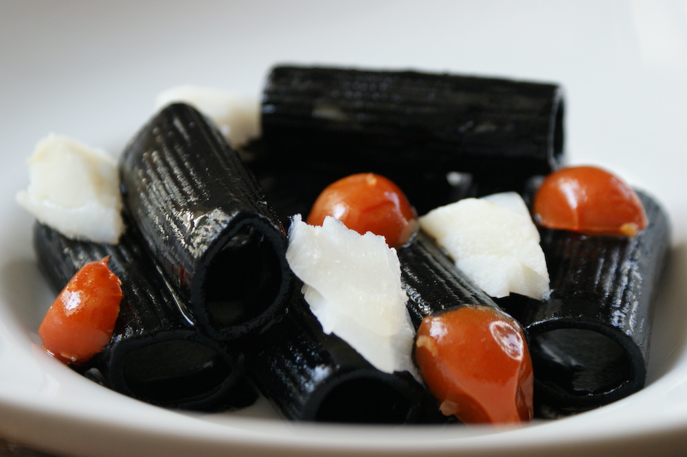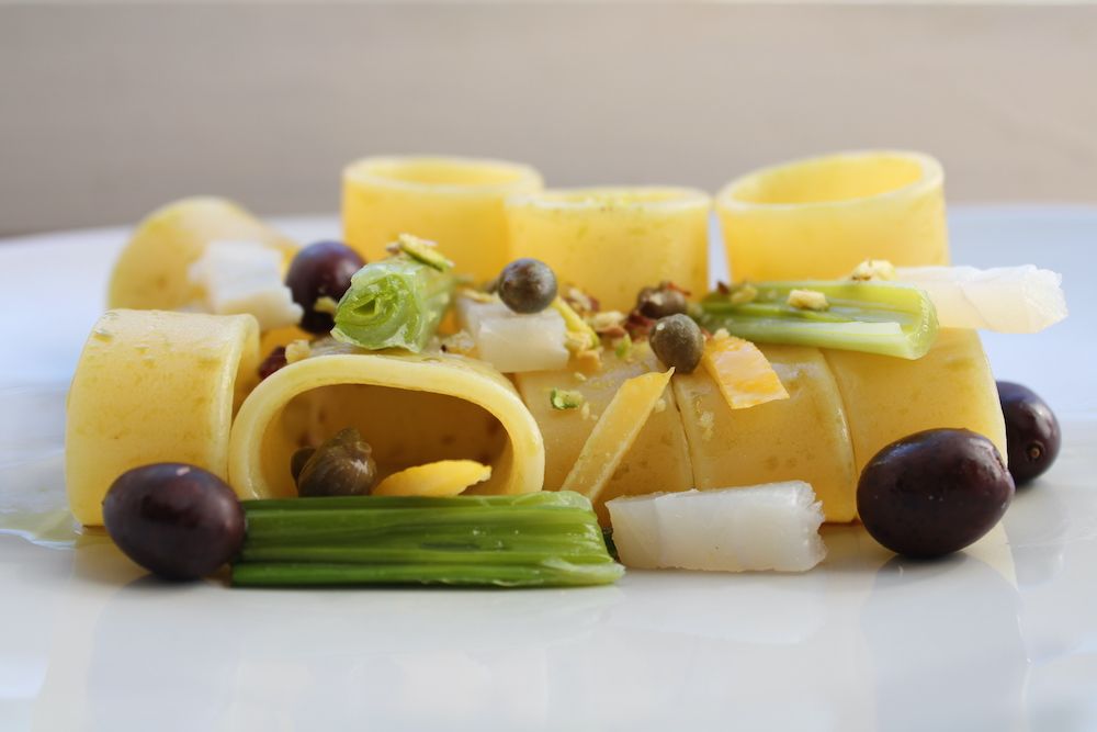 Tortiglioni, cabillaud, lard & sauge, pesto de basilic