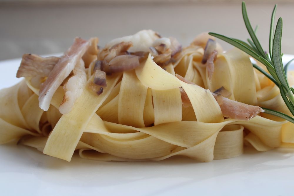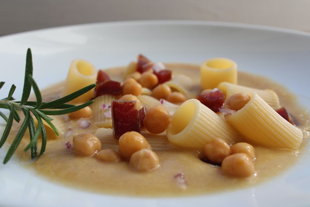 Tortiglioni, cabillaud, lard & sauge, pesto de basilic