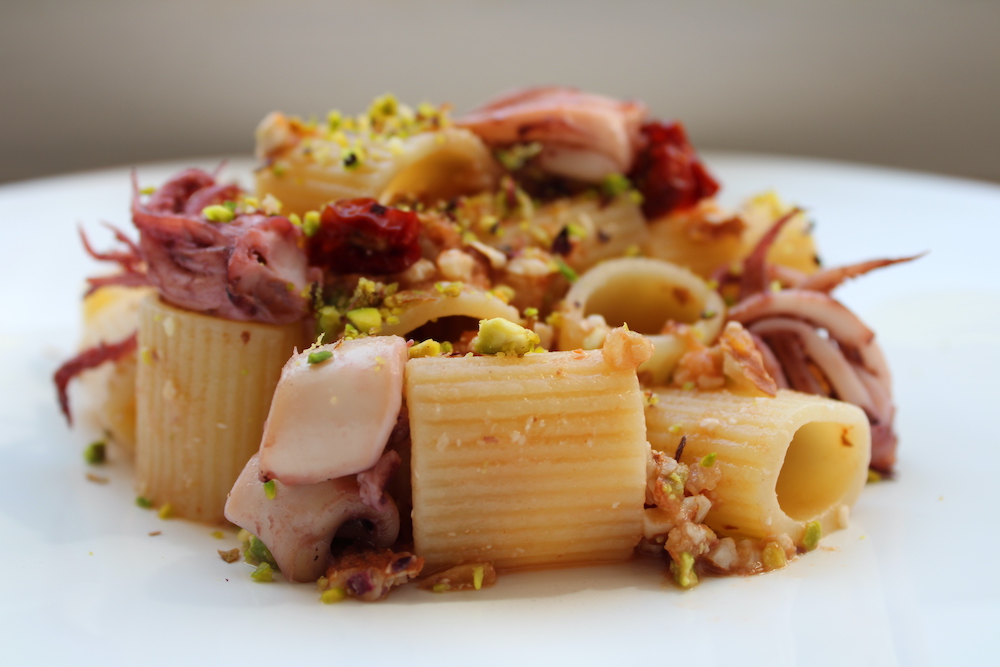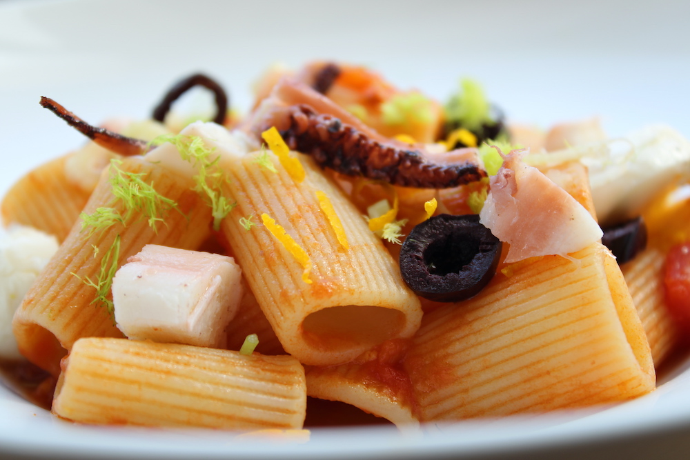 Prélever et mixer les trois quarts des pois chiches en purée. Remettre dans la casserole la purée et les pois chiches restants, laisser reprendre l’ébullition, ajouter les mezze maniche. Saler. Au bout de 10 minutes, éteindre le feu, laisser s’épaissir. Assaisonner de deux cuillères à soupe d’huile d’olive.