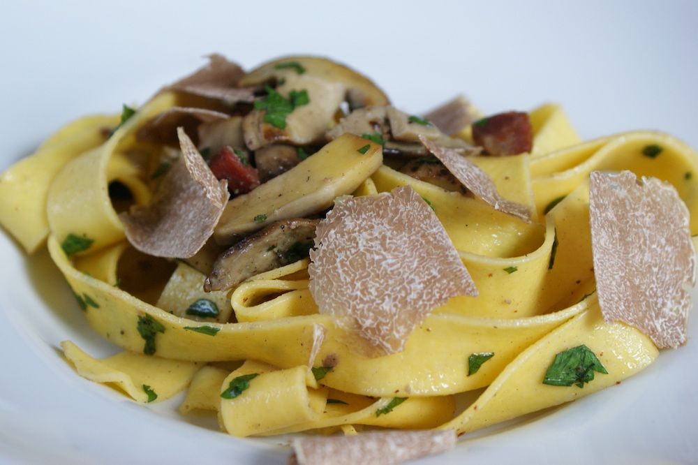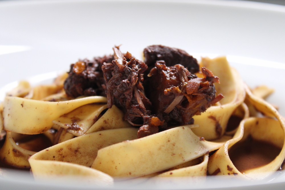 Cuire les pappardelle dans un grand volume d’eau salée et bouillante. Les égoutter al dente. Verser les pappardelle sur un tiers environ de la sauce. Remuer délicatement. Ajouter le restant de la sauce. Mélanger à nouveau.