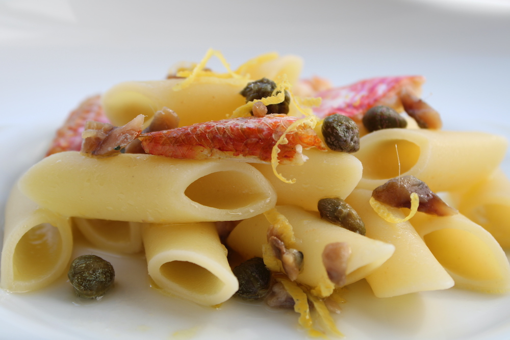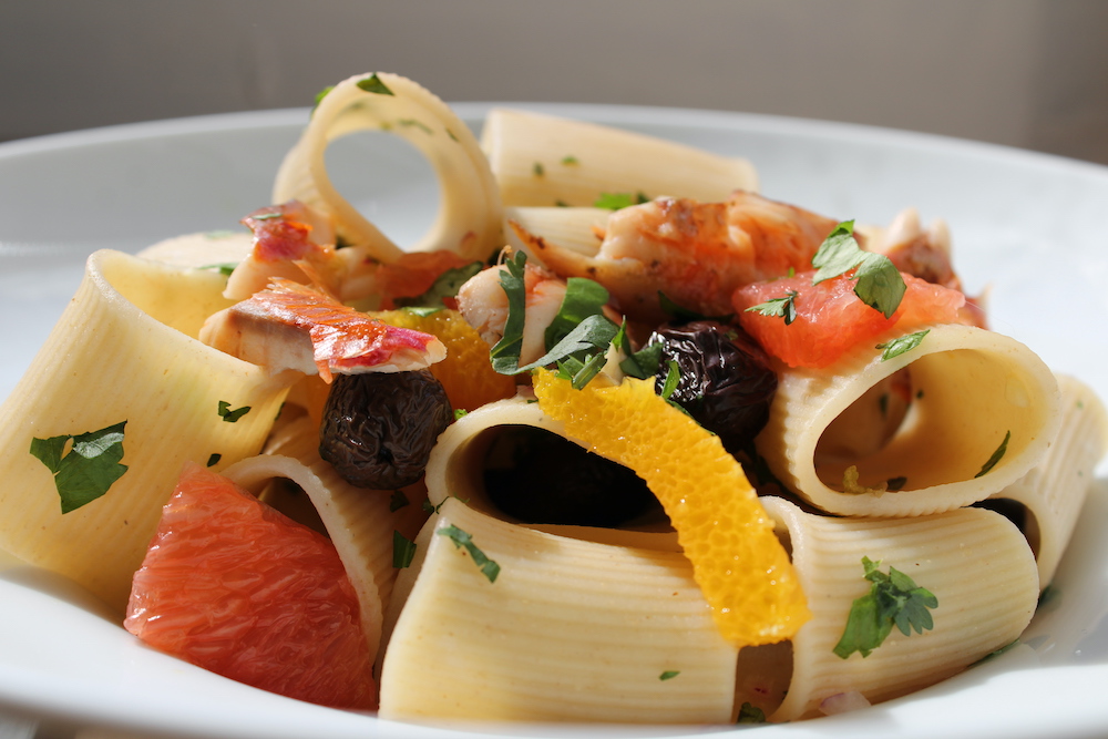 Mélanger les calamarata et la sauce à la tomate et au romarin.